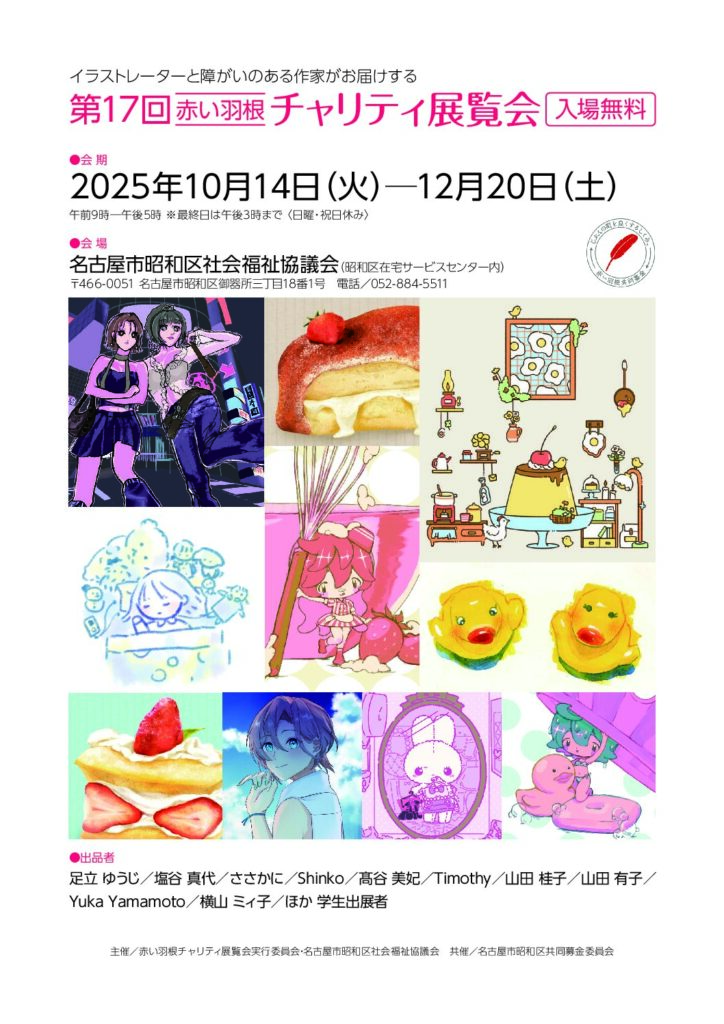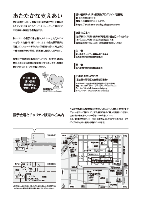 赤い羽根チャリティ展覧会ではイラストレーターと障害のある作家の作品が出品されています。皆様お誘い合わせの上、ぜひお越しください。なお、売り上げの一部は地域福祉貢献のために赤い羽根共同募金へ寄付させていただきます。